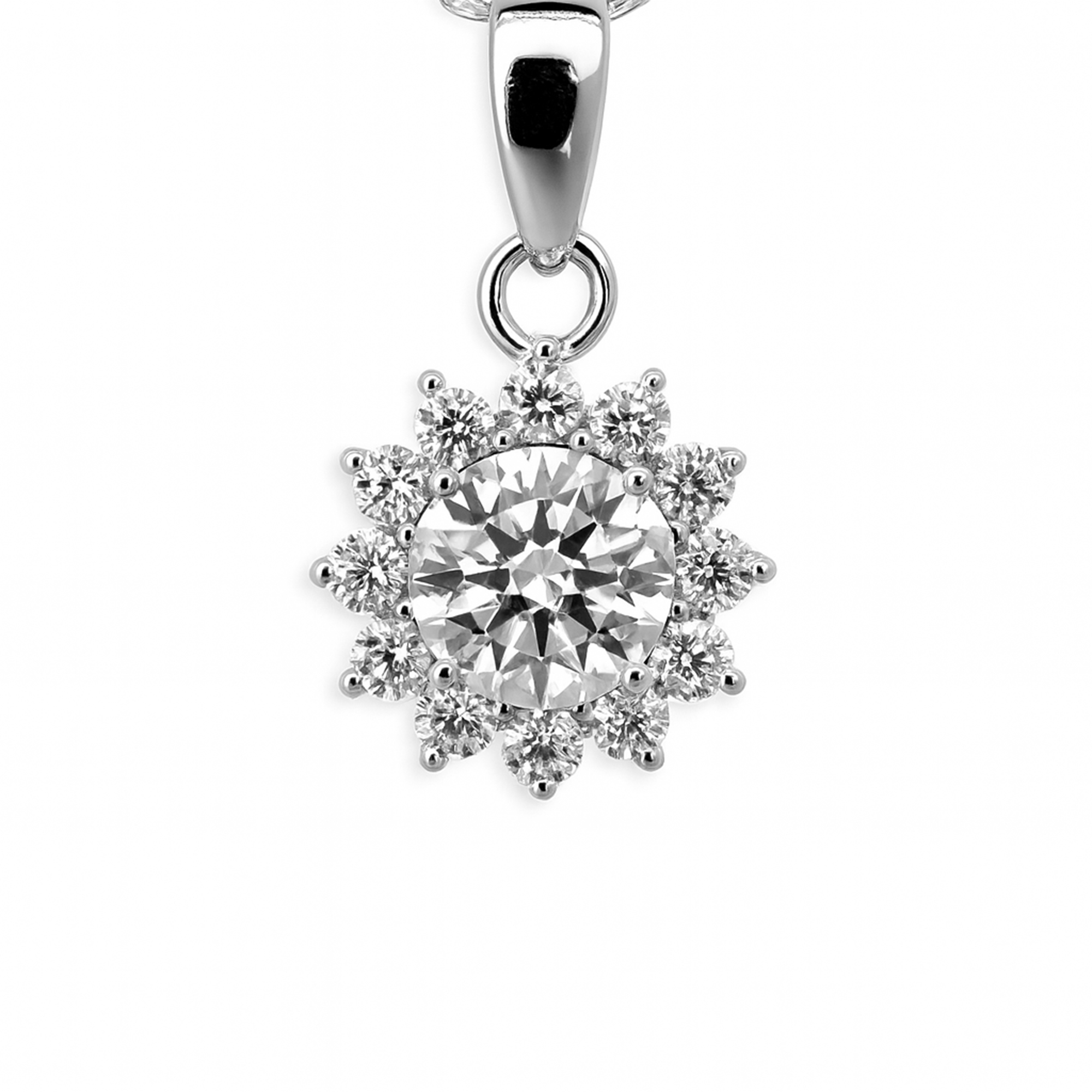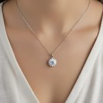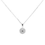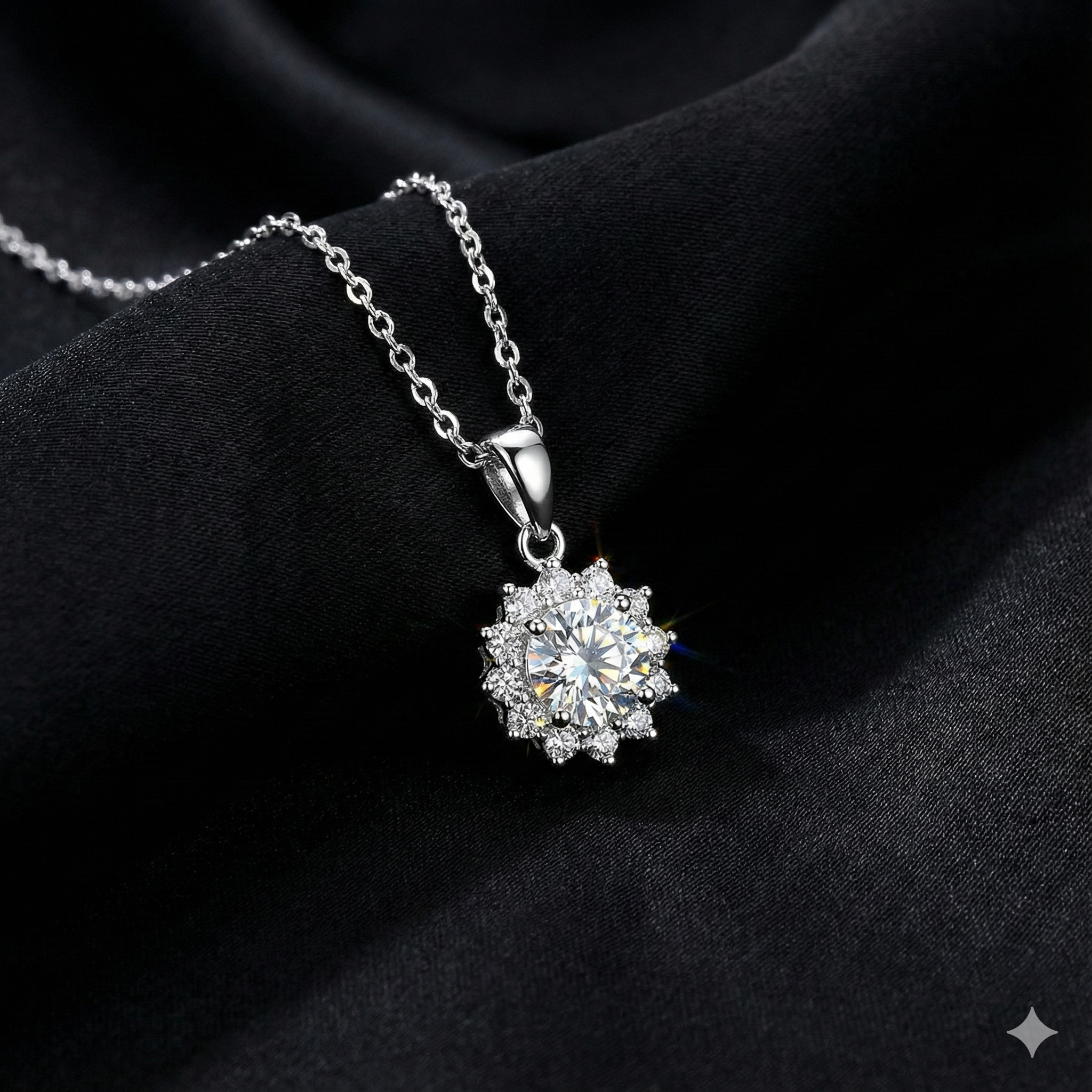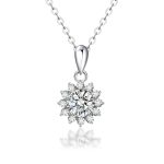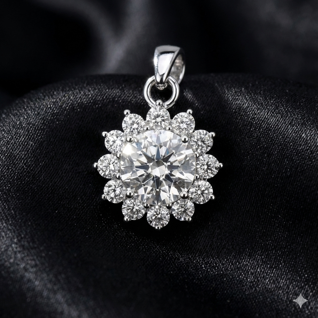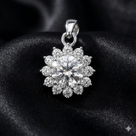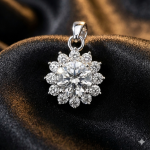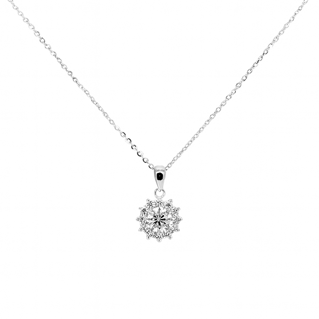 Handcrafted in pure 925 sterling silver, this pendant captures the beauty of light in motion. A 6.5mm (1ct) round moissanite forms the centerpiece, encircled by a crown of delicate stones arranged in a floral burst.