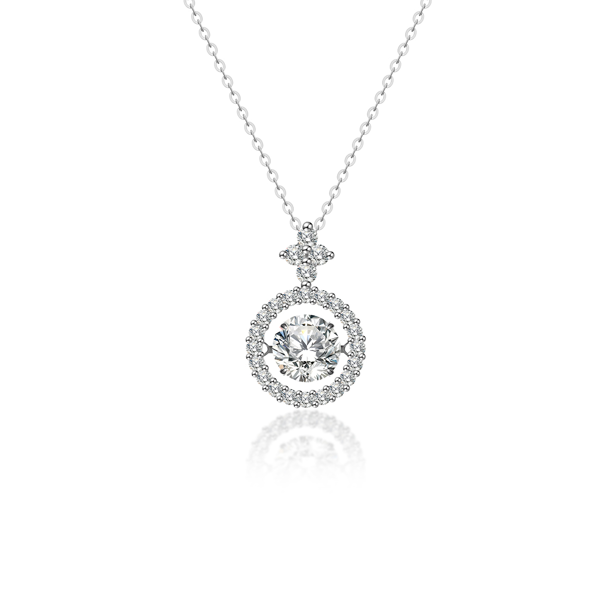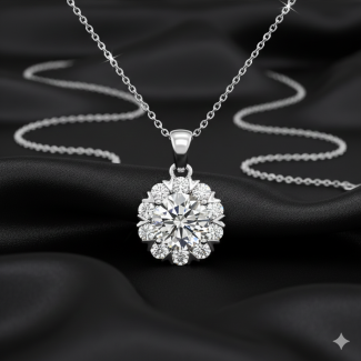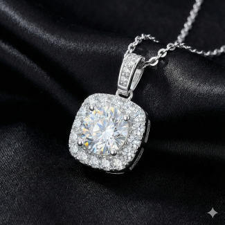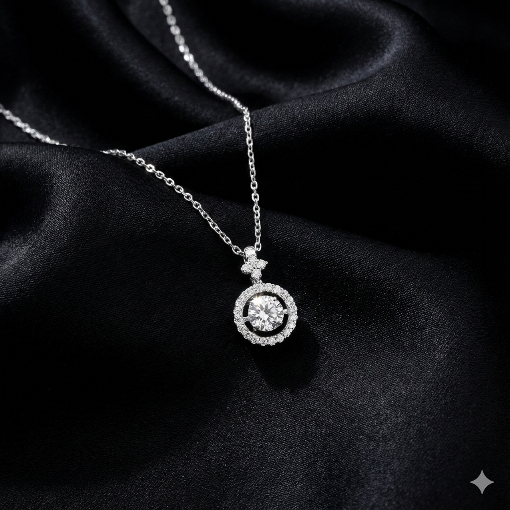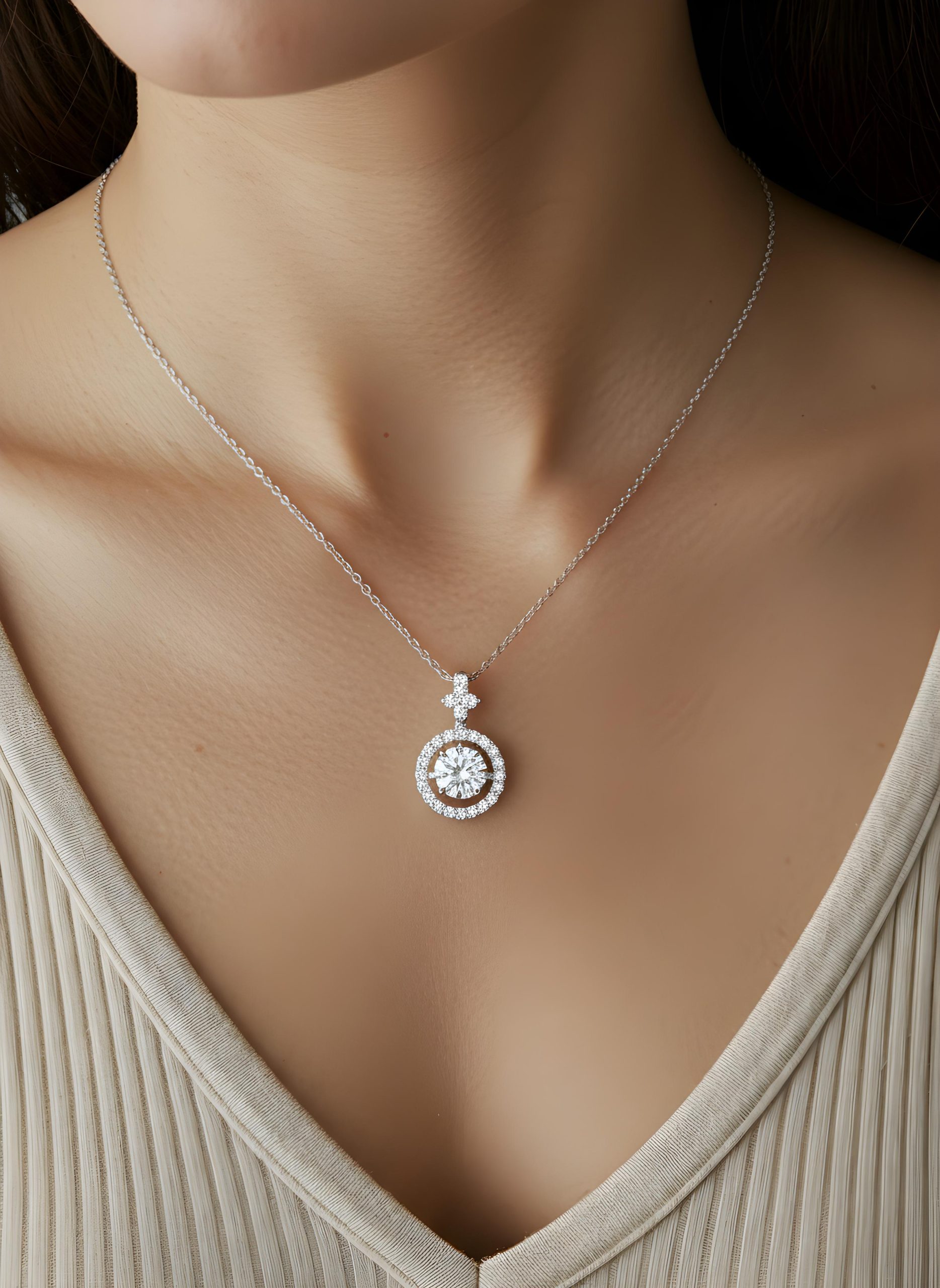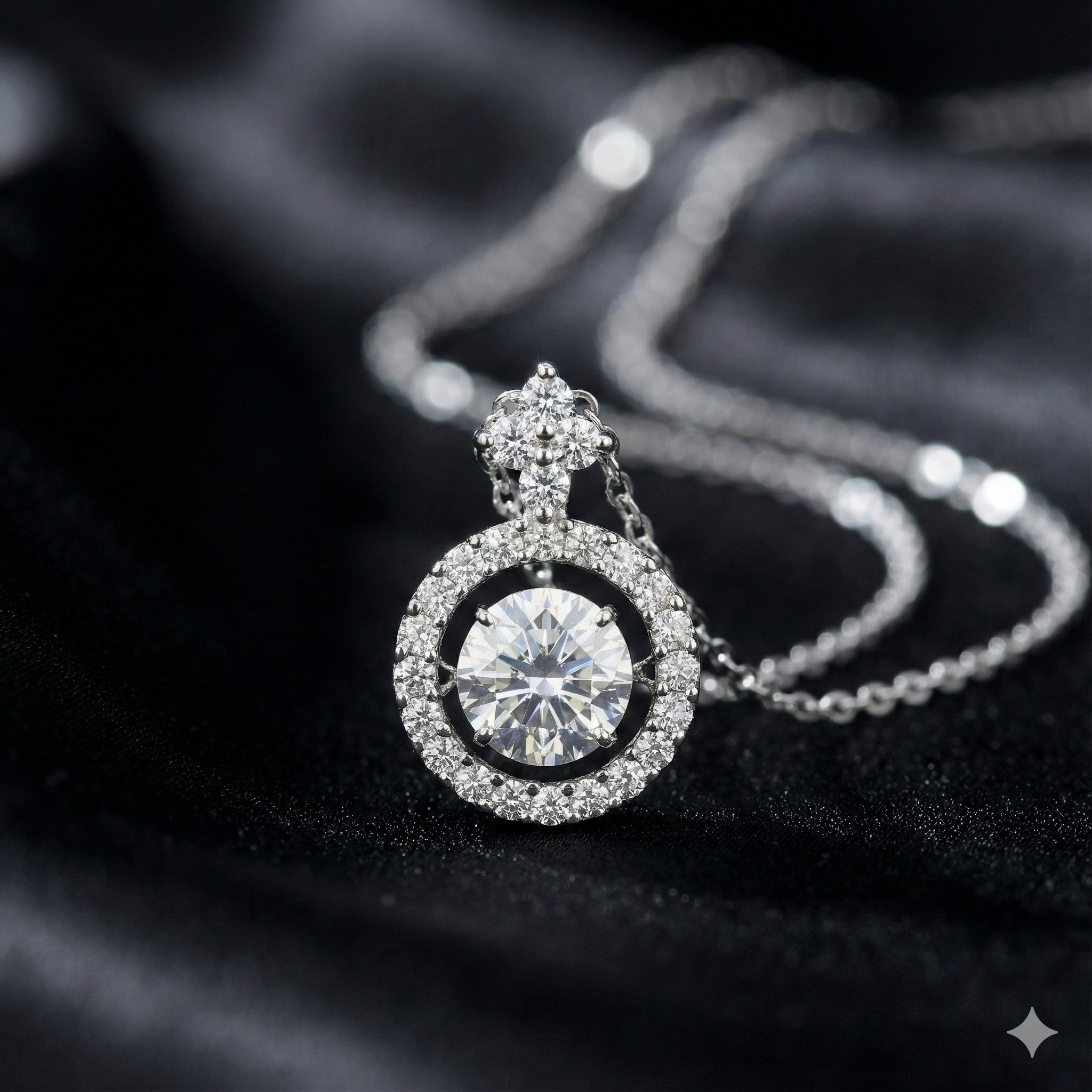 Handcrafted in pure 925 sterling silver, this pendant brings together celestial grace and modern artistry. At its core lies a 6.5mm (1ct) moissanite, surrounded by a meticulously set halo that amplifies its brilliance. The upper star motif adds a touch of whimsy and charm, while the option of silver or gold finish makes it perfect for every occasion.