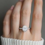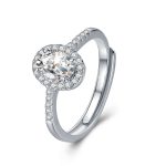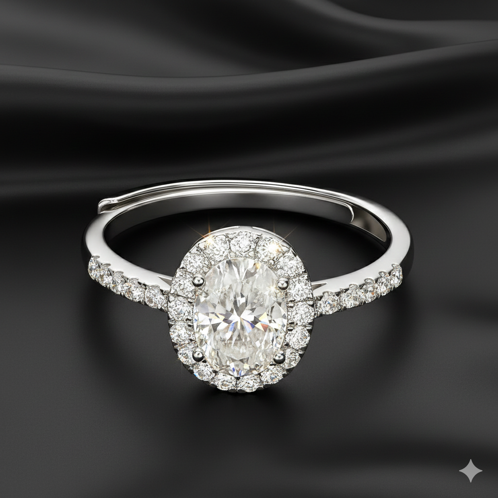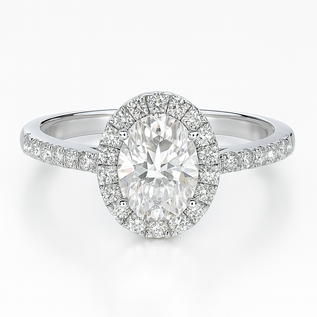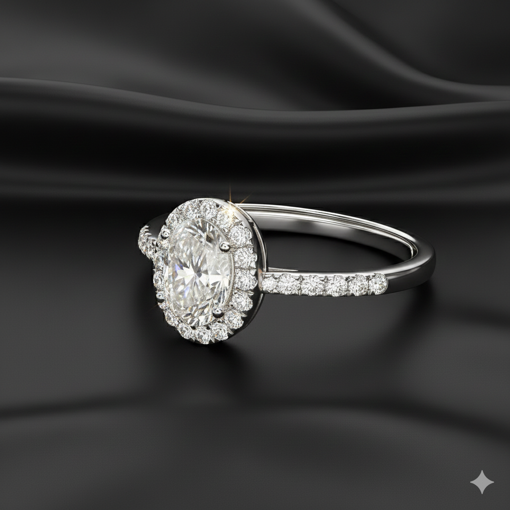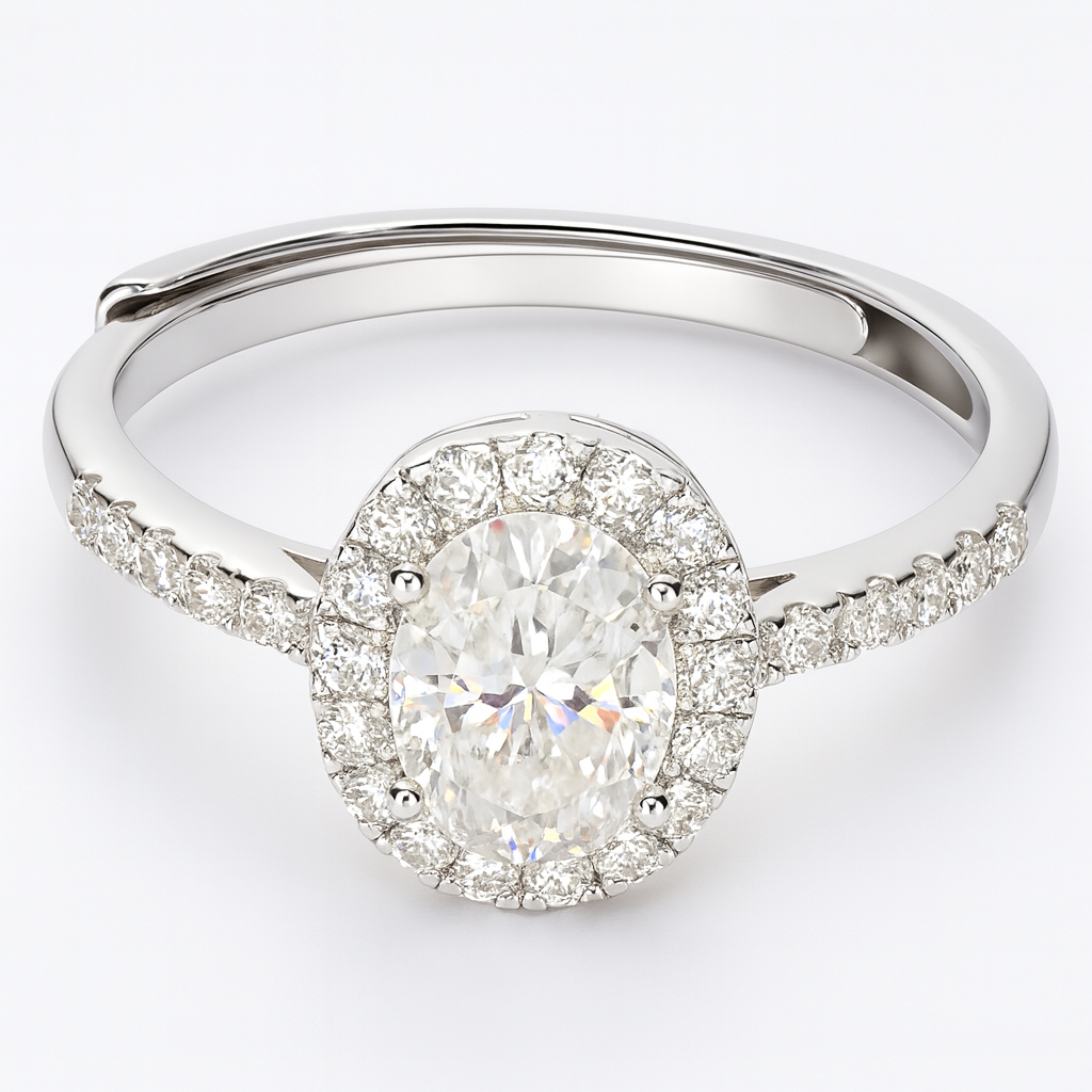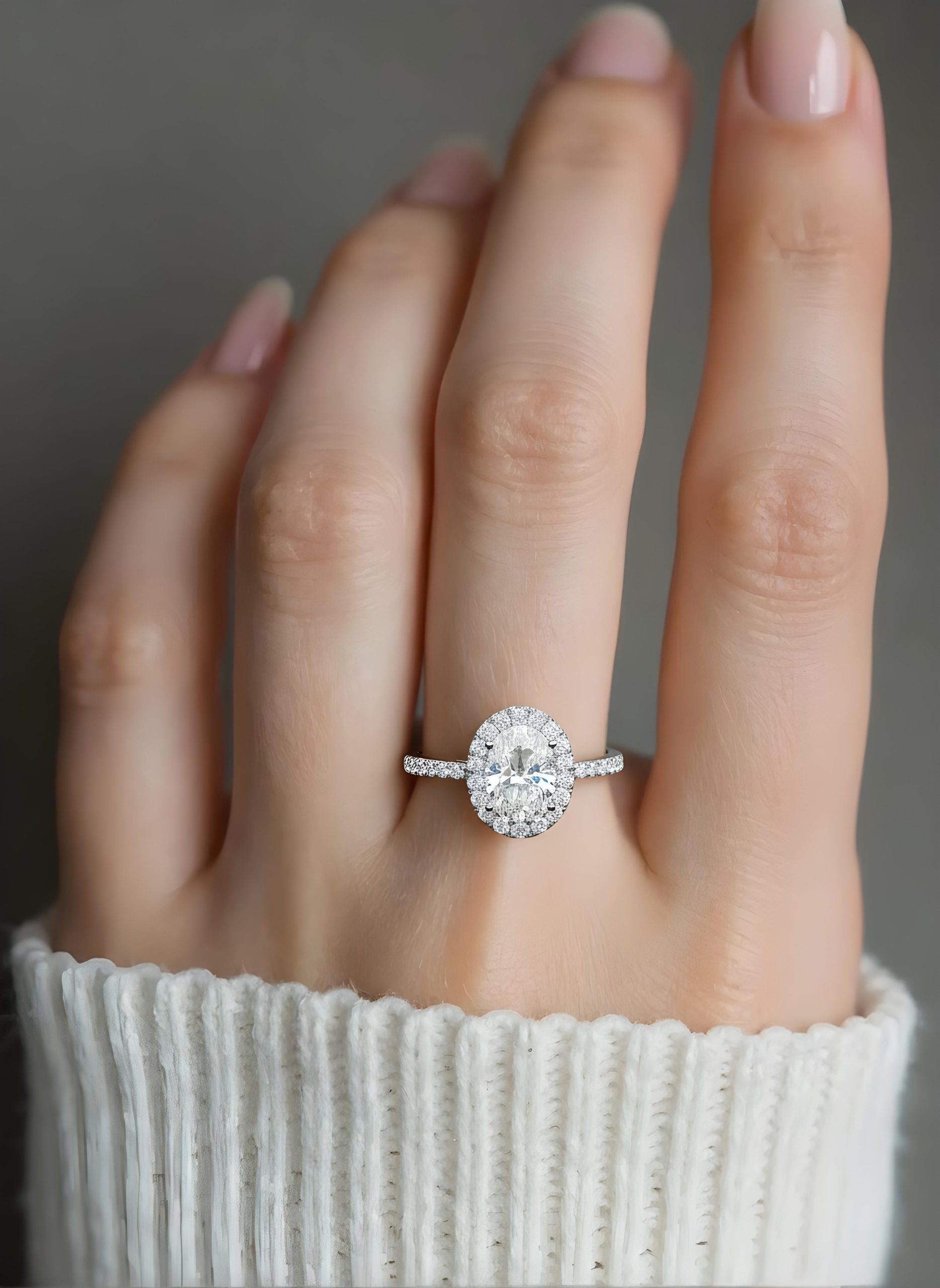 Designed to embody grace and refinement, this piece features a 5x7mm oval-cut moissanite (1.0ct) framed by a halo of micro-set round stones that amplify its brilliance. The elongated silhouette of the oval cut creates a soft, flattering presence on the finger, combining timeless appeal with a contemporary edge.