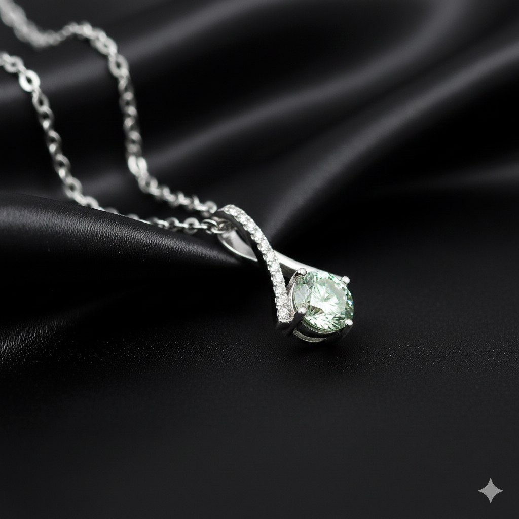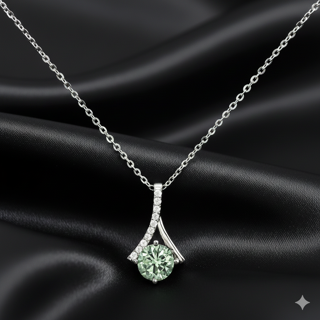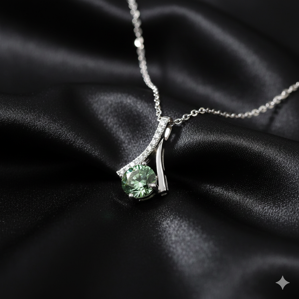 Handcrafted in pure 925 sterling silver, this pendant showcases the serene beauty of a green moissanite gemstone, radiating both depth and vibrance. Its clean lines and minimalist setting allow the stone?s natural brilliance to take center stage, while the subtle polish adds a contemporary edge.