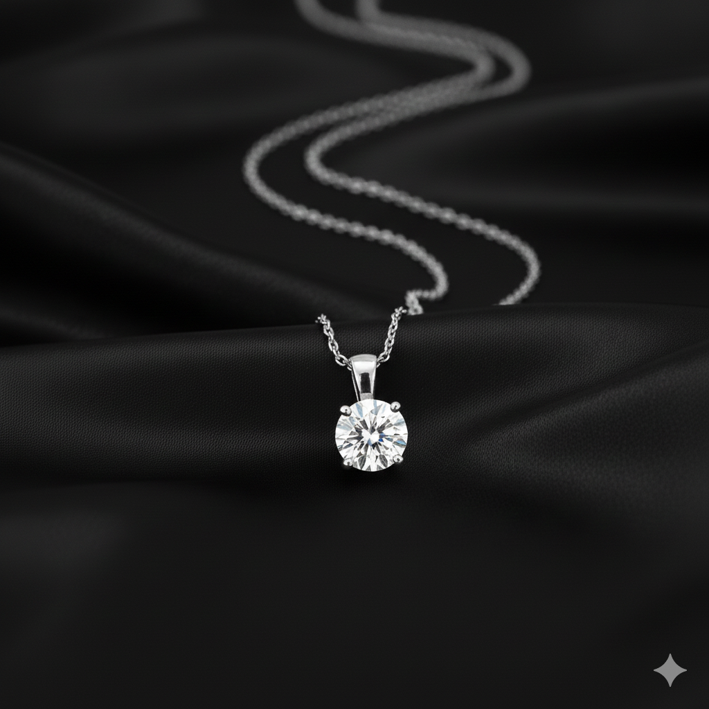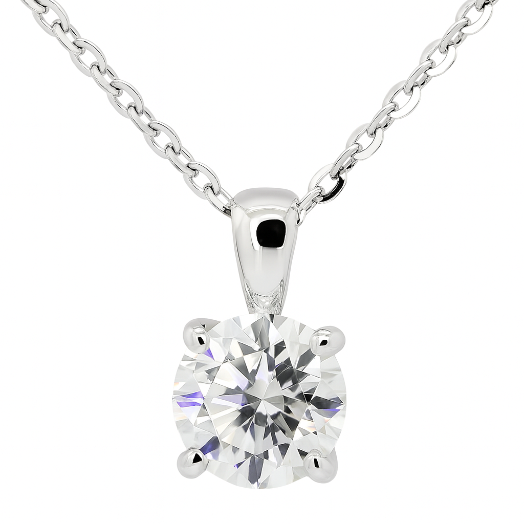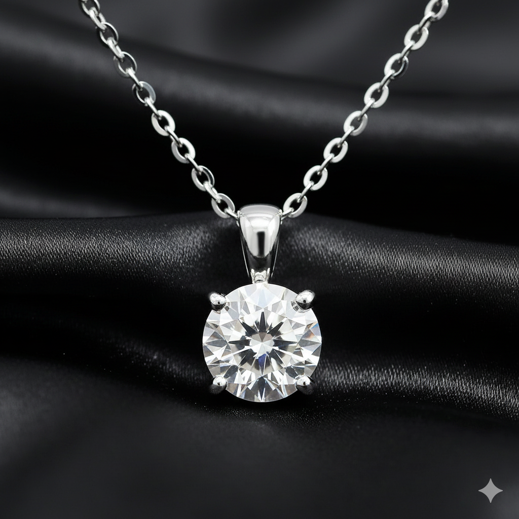 Handcrafted in pure 925 sterling silver, this pendant captures timeless sophistication in its simplest form. The round moissanite is held securely by a refined prong setting, allowing light to pass through every facet for unmatched brilliance.