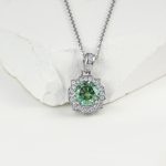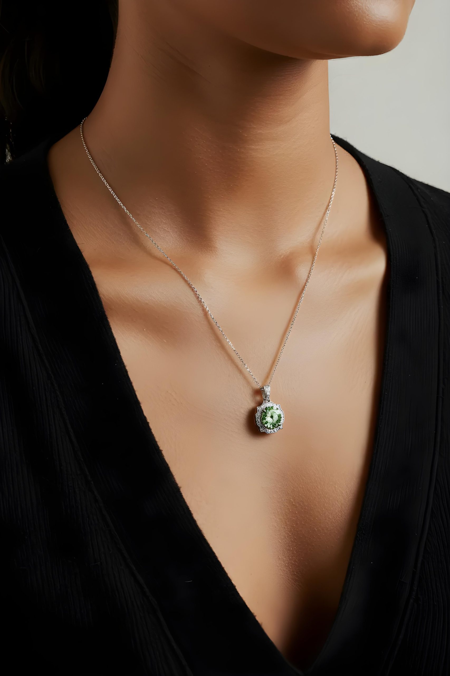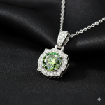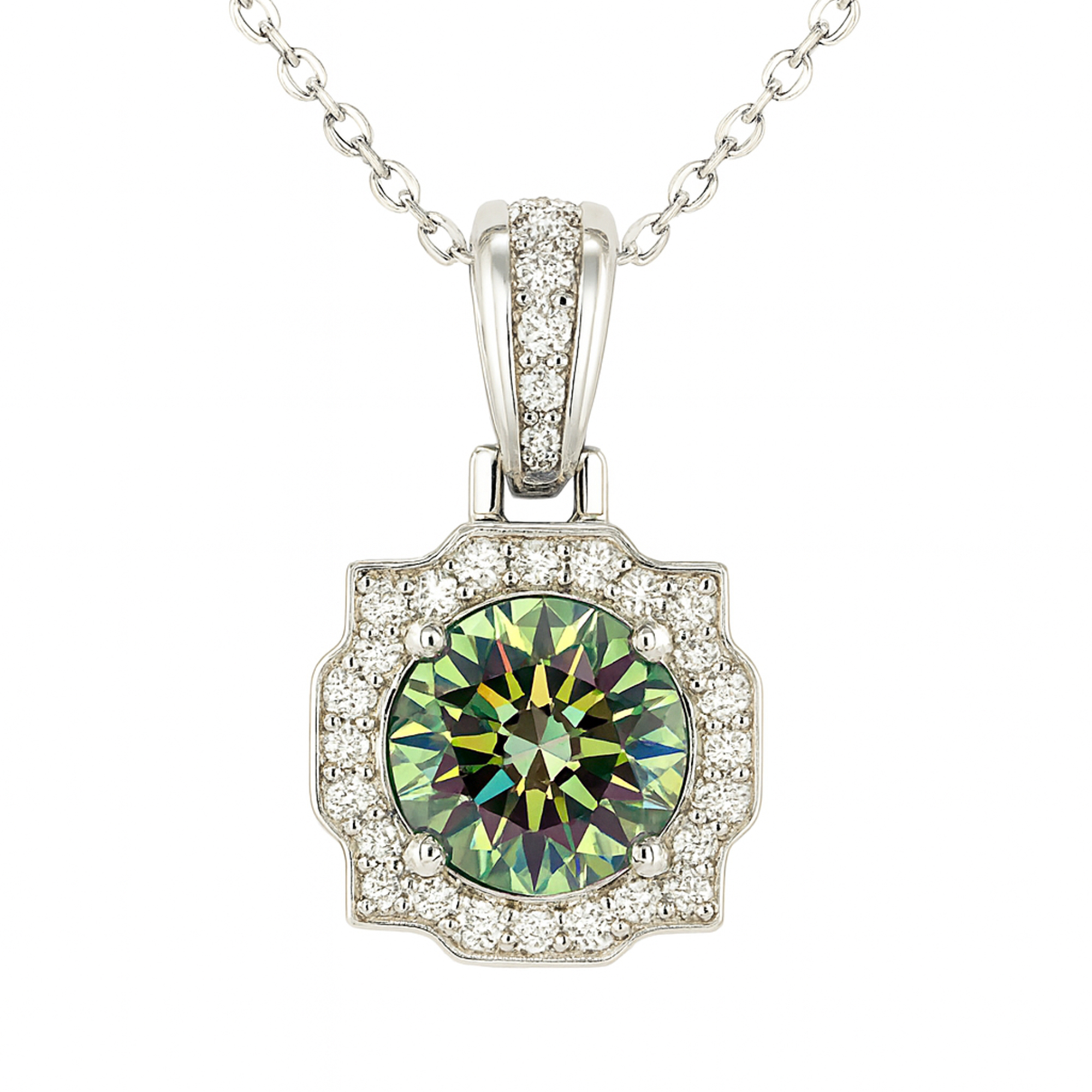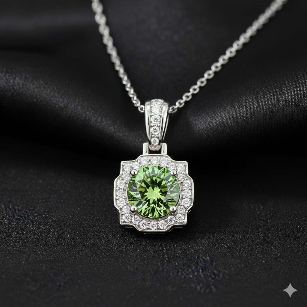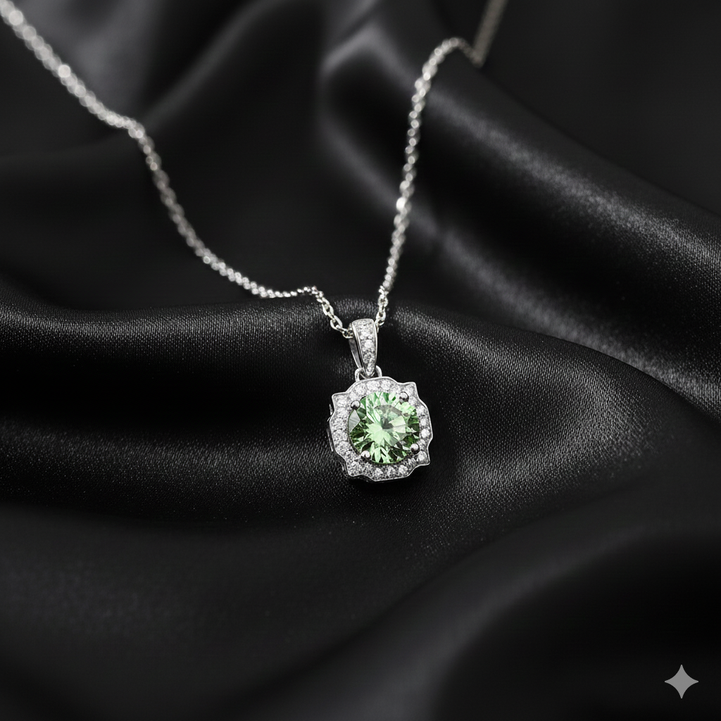 Handcrafted in pure 925 sterling silver, this pendant captures the charm of elegance reimagined. At its heart lies a vivid green moissanite, symbolizing renewal and grace, surrounded by a meticulously detailed halo that enhances its glow.