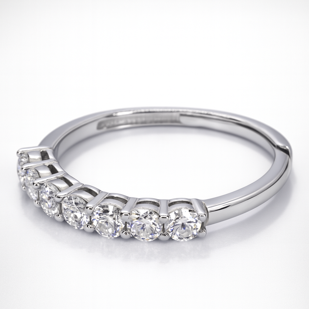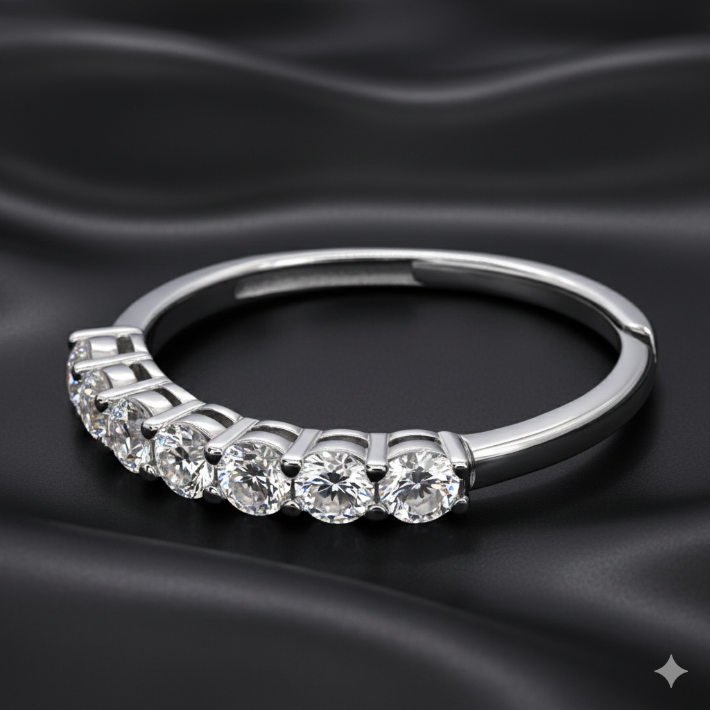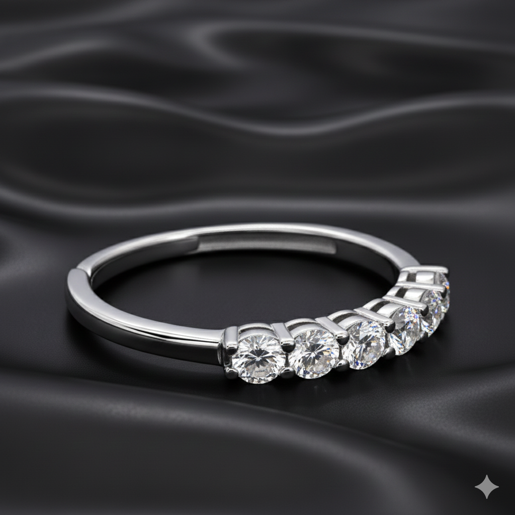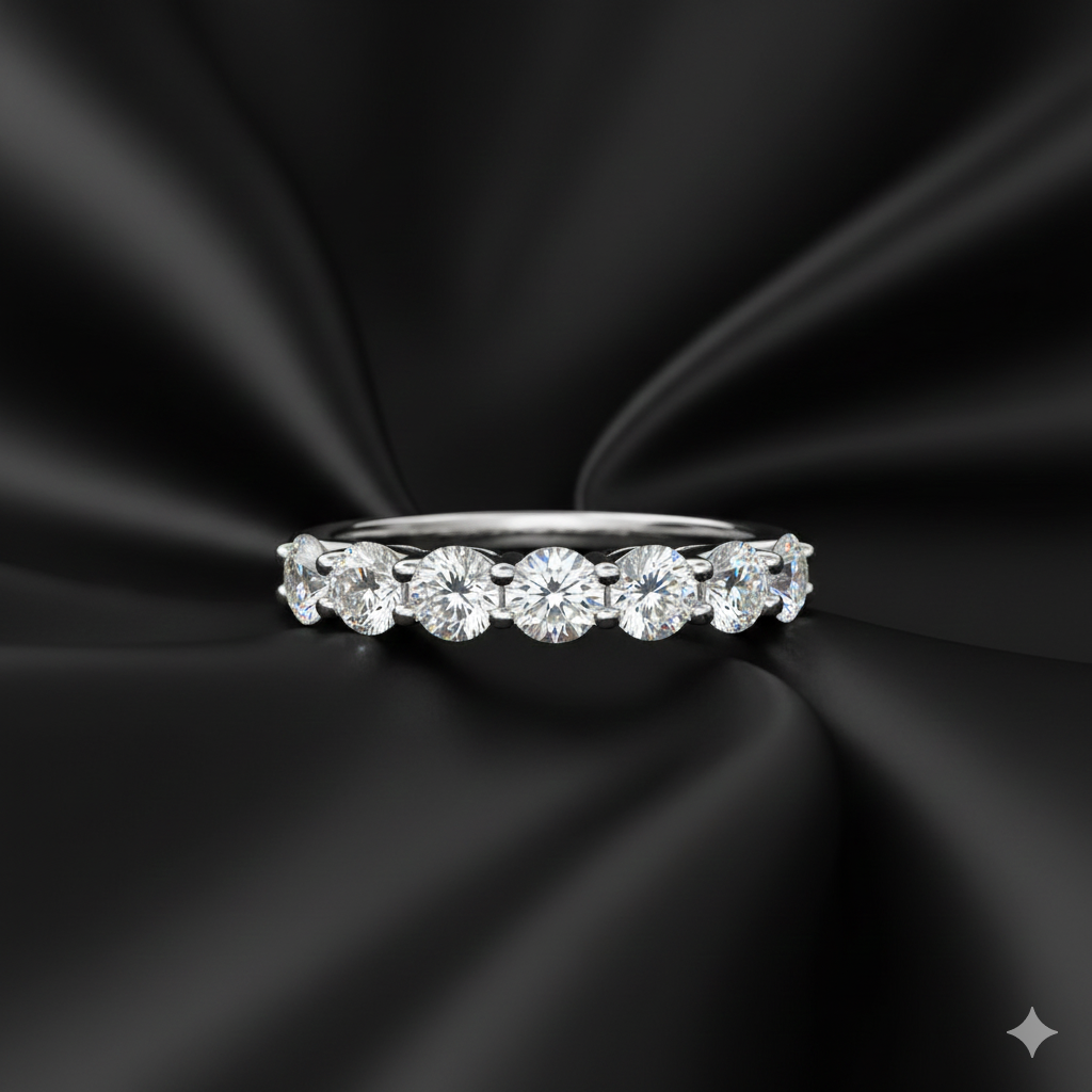 Minimal yet impactful, this band features seven round-cut moissanites (3.0mm each) that flow seamlessly across the top in a half-eternity style. Each stone is prong-set to allow maximum light reflection while maintaining a smooth, elegant contour along the finger.