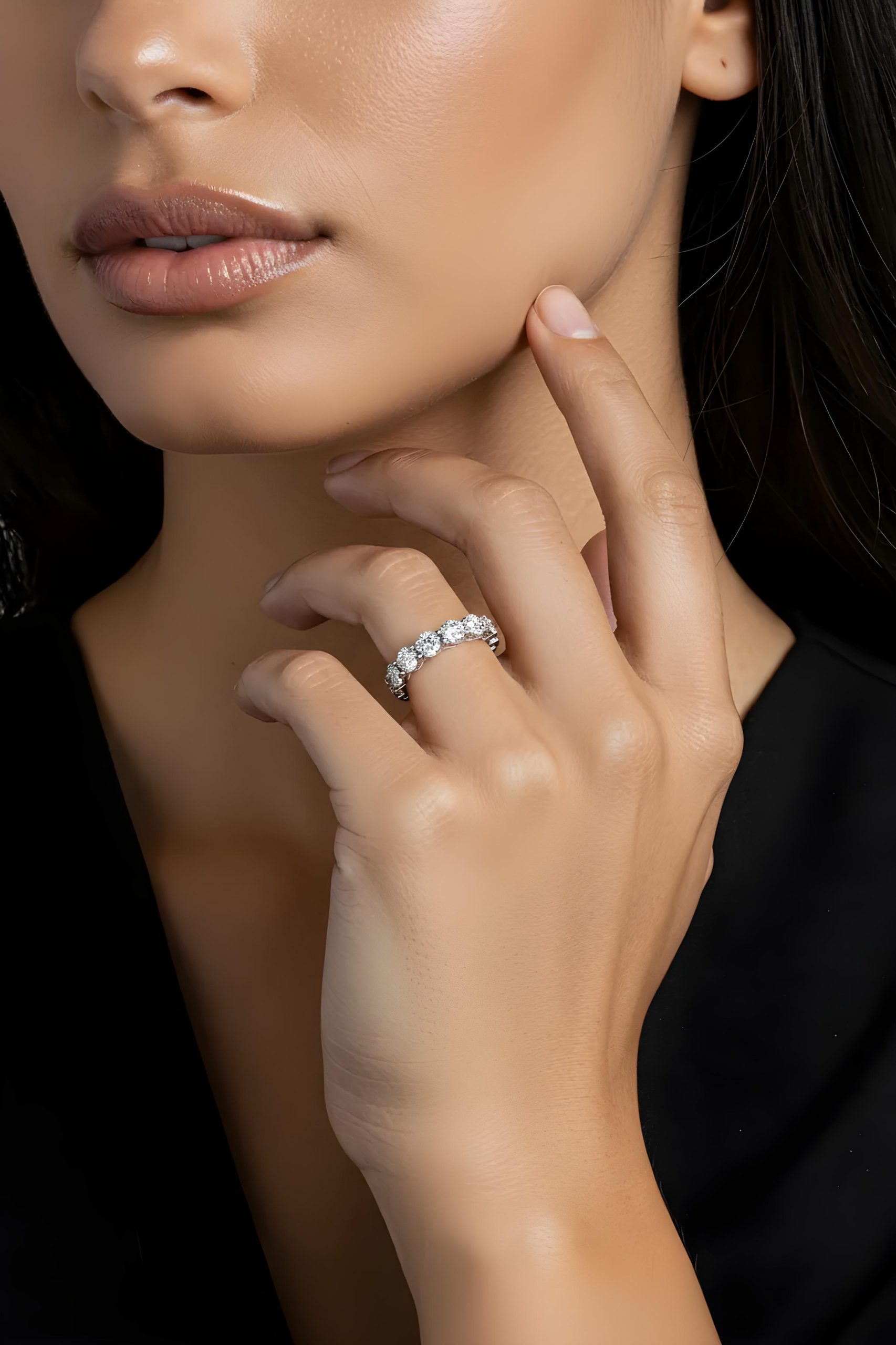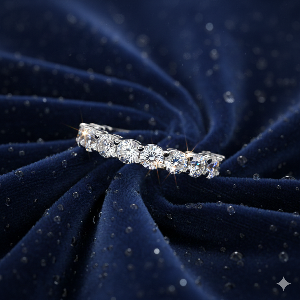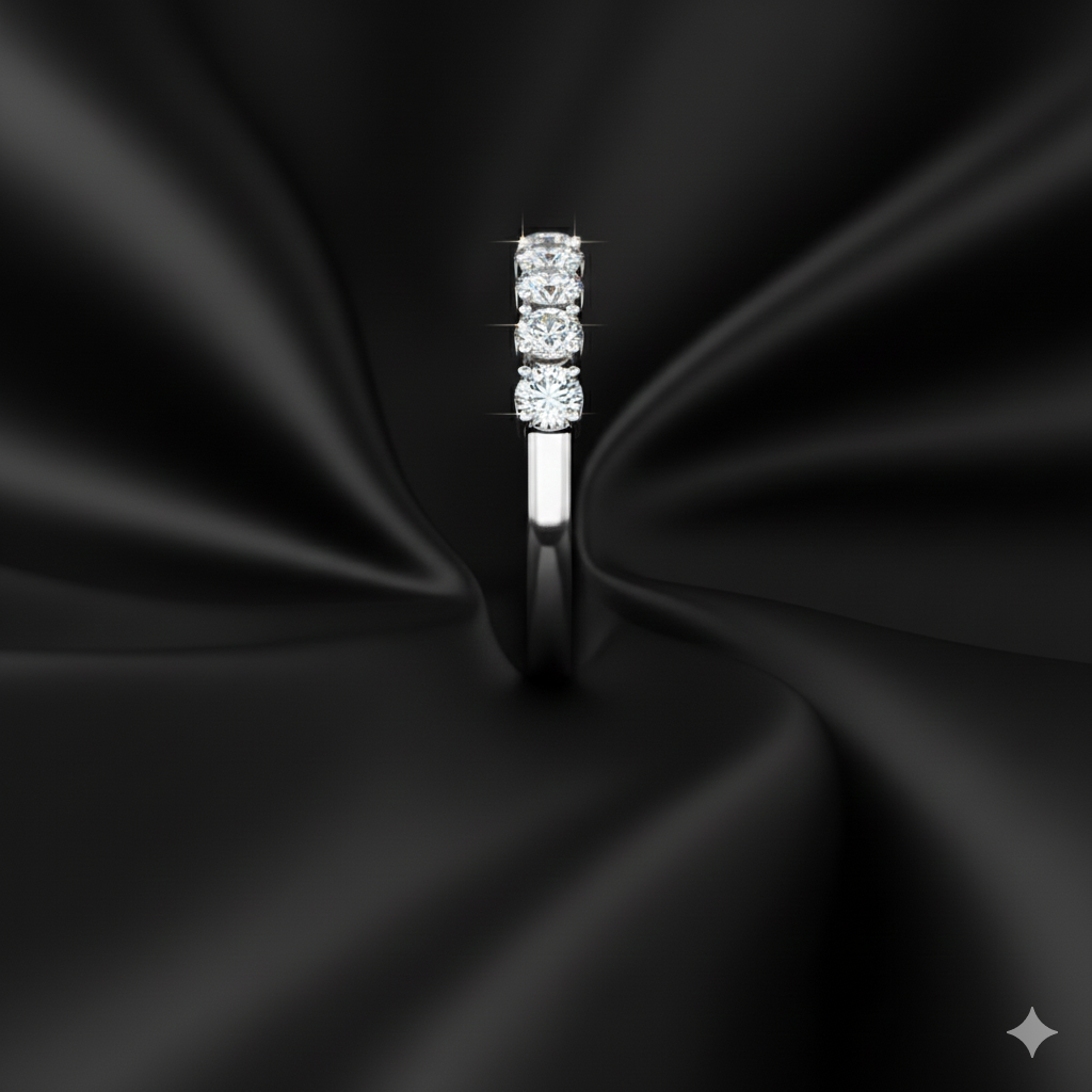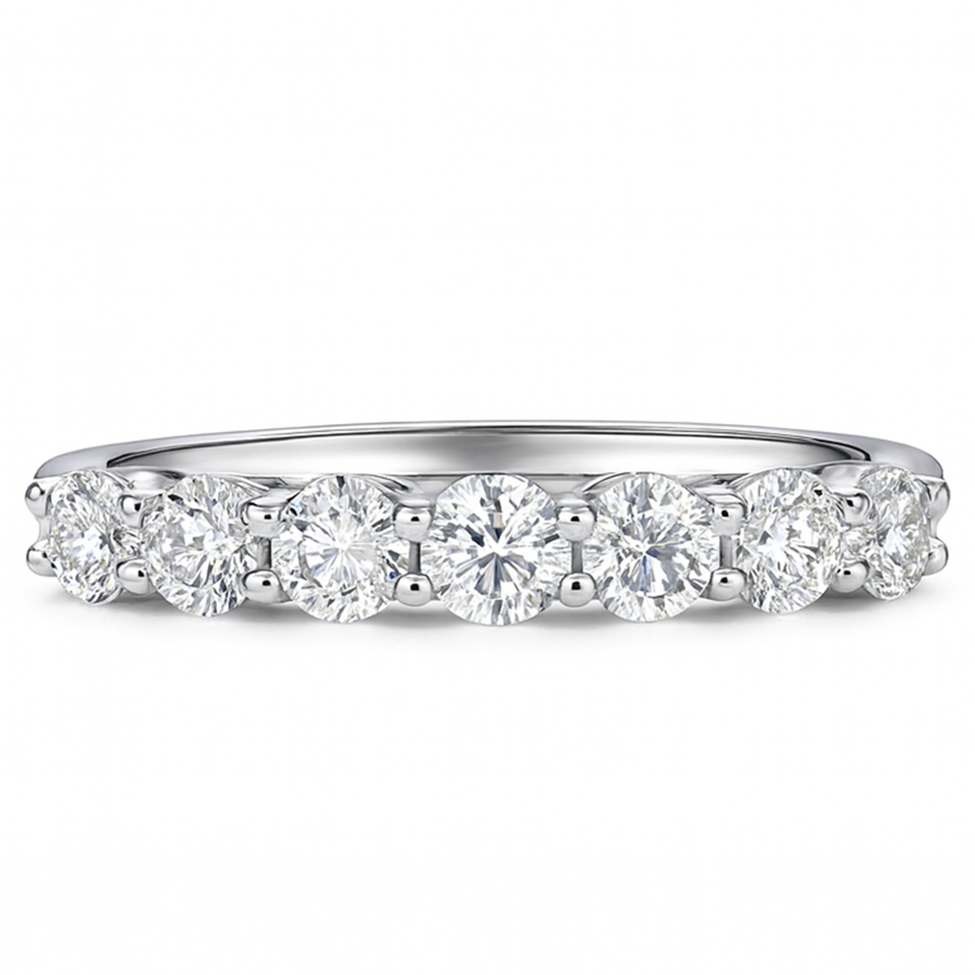 Minimal yet impactful, this band features seven round-cut moissanites (3.0mm each) that flow seamlessly across the top in a half-eternity style. Each stone is prong-set to allow maximum light reflection while maintaining a smooth, elegant contour along the finger.